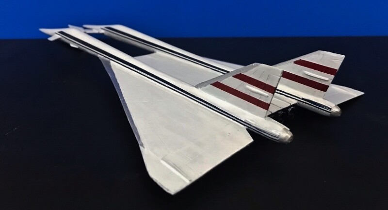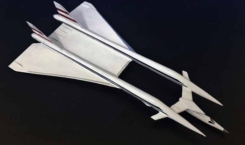 双胴のスタイルを持つ機体デザインはITCの「国際救助隊サンダーバード」の影響を色濃く受けた機体です。胴体はプラ棒にパテの盛り削り、主翼は木材で出来ています。
