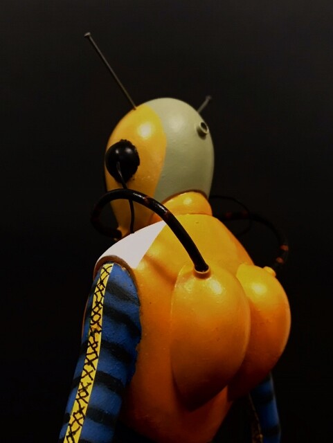 かなりな部分でマスキングが必要なので、塗装する手順が大事になってくるのですが、老朽化した脳髄で自分なりに考えてチャレンジwwwまず最初にオレンジ+マットイエローで上半身のオレンジ部を、次にクリームイエローに艶消し混ぜて足の黄色い部分をエアブラシ、腕はガッシュの露草色というブルーを筆塗しました。続いてマスキングしてマットブラックを吹き、脚のラインはまず陸自の濃緑色で太いラインを、細いラインはNATOブラックを吹きました。一回塗ったんですが飛沫が飛び散って失敗、いったんシンナーで拭き落としてから再度塗り直したんですが状況はあまりよくならず、根性が尽きたのでこんな感じで降参しました