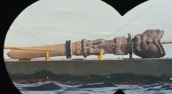 今更ですが、悪魔の笛とは1970年公開の大映映画『ガメラ対大魔獣ジャイガー』に登場し、物語のキーとなる石像です。設定ではかつてムー大陸が有ったとされる地域(海域?)に存在すると言うウェスター島に有るとされ、劇中冒頭では「一体誰が何の目的で建てられたか判らない。」とされていました。(解説している万博広報部員を演じている炎 三四郎さんは、後の仮面ライダーXこと速水 亮さん)
