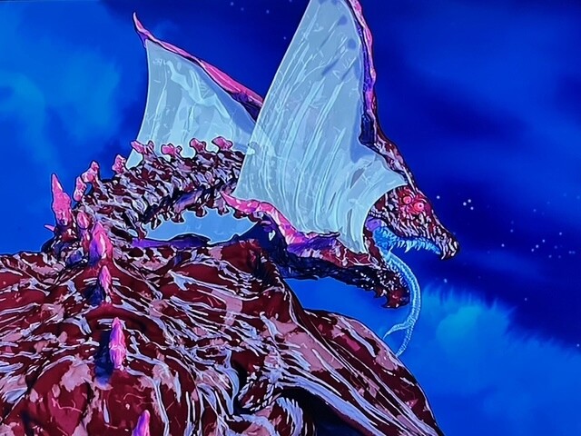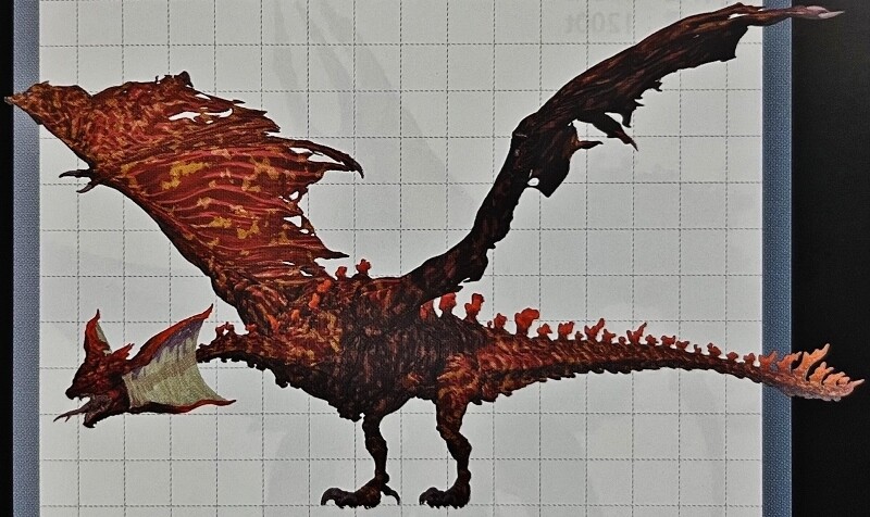 ただ、眼が4つ、頭部のツノには反射膜があり、翼は長大ですがあまりの巨体のため飛行能力を失っていてボロボロに破れています。なにより特徴的なのは全身の毒々しい赤茶けた斑模様で、まさにラスボスにふさわしい禍々しい容姿をしています。