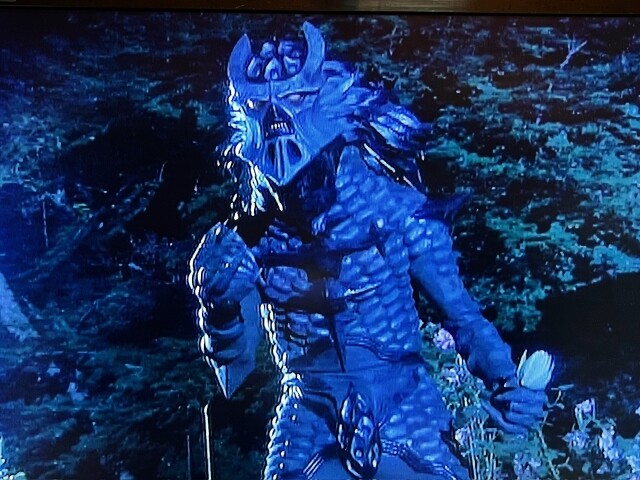 人間体の異星人が、水に触れることによって細胞が変異し獣化するという設定なんですが、身体にあるシンメトリーで人工的な模様といい、頭部の硬質な造型といい、デザイン的にとても細胞が変異して発生した怪物とは思えません。それに着ぐるみに使用する素材の関係なのか、身体の質感にどうしても違和感を感じます。その上、造形自体あまりにも整いすぎていて生物(ナマモノ)感に乏しく、魂を持った生命体にはとても見えませんですゥ…