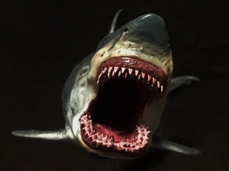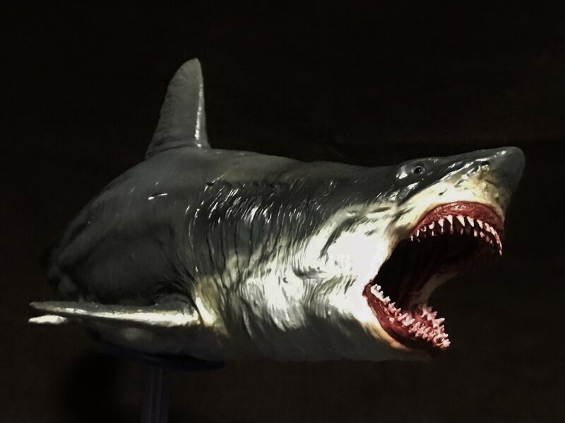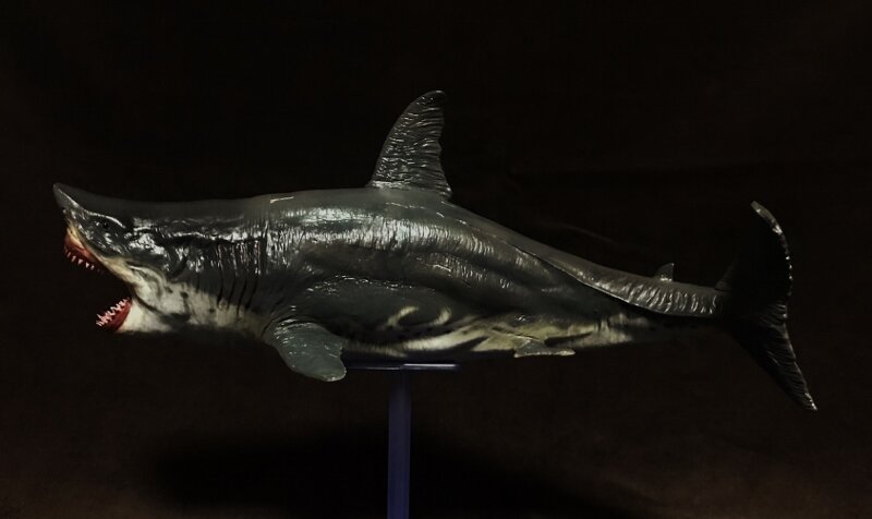 以前、ジョーズ(ホホジロザメ)のTOYをメガロドン風に改造したことがあったんですが、これは最初から「メガロドン」としてモデリングされたアイテムで、以前のTOYに比べると再現性が桁違いです。PVC製ですが、歯とか十分薄く鋭く再現されています。パーティングラインもきれいに処理されてて目立ちません。大きさも32cmほどありますからボリュームも十分デッス。ただ塗装は中国塗りなのでいまいち繊細さに欠けますが、とりあえずそのままにしてベースだけは明るいベージュ色だったので海風に青く塗りました。