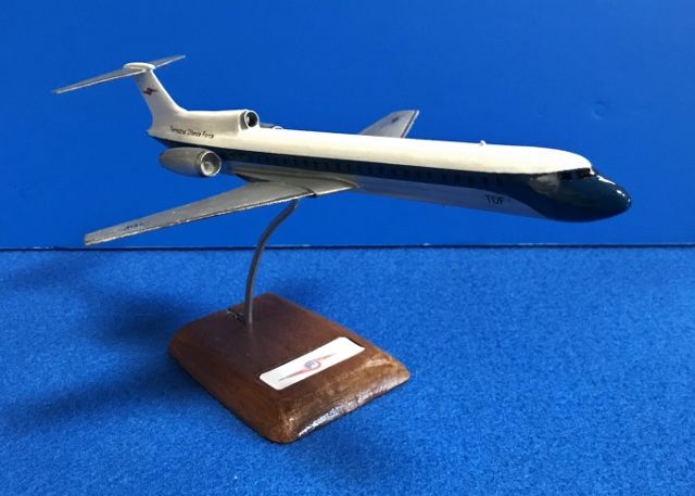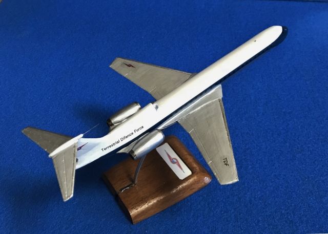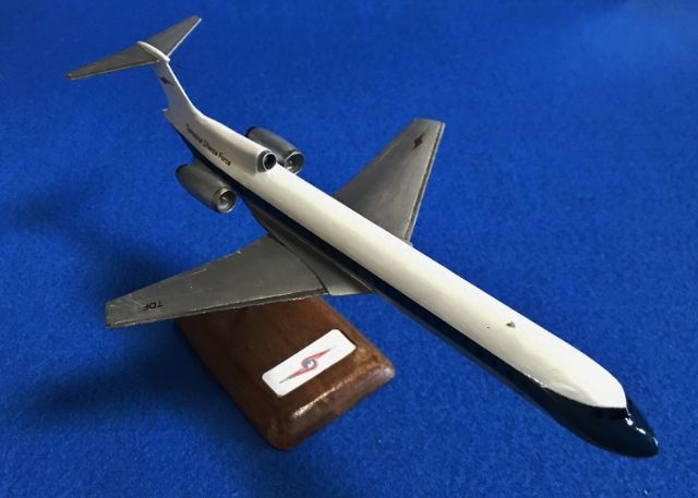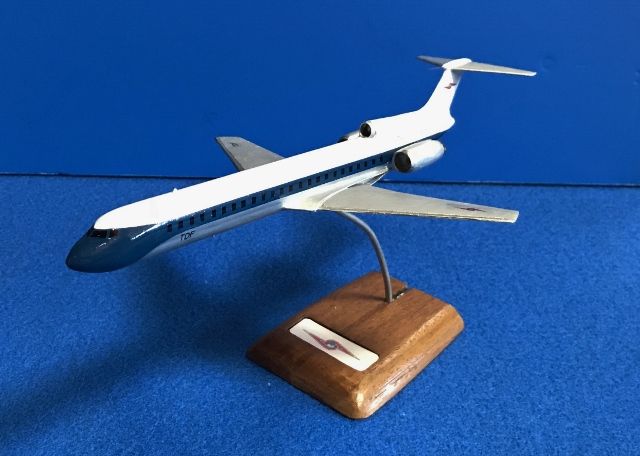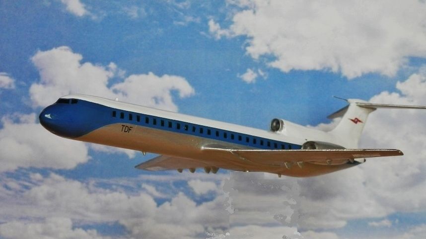 模型の元はハセガワのMD87(1/200)ですが機首の形がボーイングに近い感じなのでプラ板を貼り付けて中心を上げてとがらせ、垂直尾翼の前にパイプを取り付けて第3エンジンにして周りはプラ板とパテ、主翼もプラ板を前に貼り付けて大きくし超音速旅客機らしく薄くしたそうです。